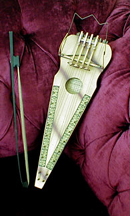 This tricked-out marxolin features two bodies stacked atop one another, a bow with TWO ribbons of hair with a double rosin holder, springloaded hammers to strike chords, and attitude. Sporting a sci-fi/funny-car-style paint job, it even has a whammy bar! Check out all the wild details. Kudos to Sharon Kahn for bringing this to my attention. Here's her own personal Rock and Roll Marxolin.