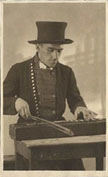 Also in the way of early ukelins we have the genty in the top-hat to the right. He's playing what looks to be a bowed box with frets. This photo was kindly forwarded to me by Garry Harrison, who proposed this to be the Official Uniform of Ukelinists Worldwide. (According to Ian Summers the photo depicts a Psalmodikon, developed in Norway to provide easy accompaniment for hymns, and isn't related to the ukelin. But I'm leaving the photo up anyway.)
