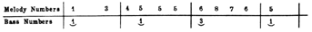You will notice that the melody numbers are not spaced equal distances apart. They are arranged thus to convey to you the idea of the time on each tone. The bass number is played, of course, at the same time the melody number directly above it is played.