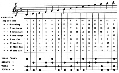 PLACE THE INSTRUMENT on the table directly before you, with the larger part of the instrument nearest you. Place the left hand on the bass chords, and hold the bow in the right hand.
