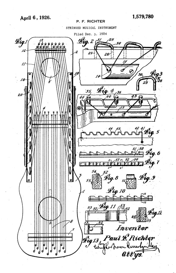If the figure above is the ukelin's baby picture, then patent number 1,579,780 is its birth certificate. Filed December 3, 1924, this patent was awarded April 6, 1926 to Paul F. Richter. Mr. Richter then assigned the patent to the Phonoharp Company of 150 Liverpool St. East Boston, Massachusetts, and its subsidiaries (which included the Bosstone Company) who sold ukelins.