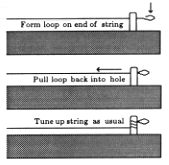 So many people have asked me, "When replacing a string, how do I know when I have wound a string enough times on the pin? How far into the ukelin should I turn the pin?" I tell them to remember to back up the tuning pin as many revolutions (counter-clockwise) as the string is wrapped on the pin. Then remove the old wire. Put the new string through the hole about one-quarter inch past the hole, bend over the end, and turn the pin clockwise the same number of turns. Better yet, use the method I developed years ago. After pulling the string through the hole, double the end over about one quarter of an inch with needle-nosed plier. Then, carefully guide the loop back into the hole before rewinding. This technique helps keep the string from pulling back through the hold while tightening, and you won't have those string ends stabbing your fingers or pulling the threads of your clothing. When tuned the string should come tight with the pin back where you started.